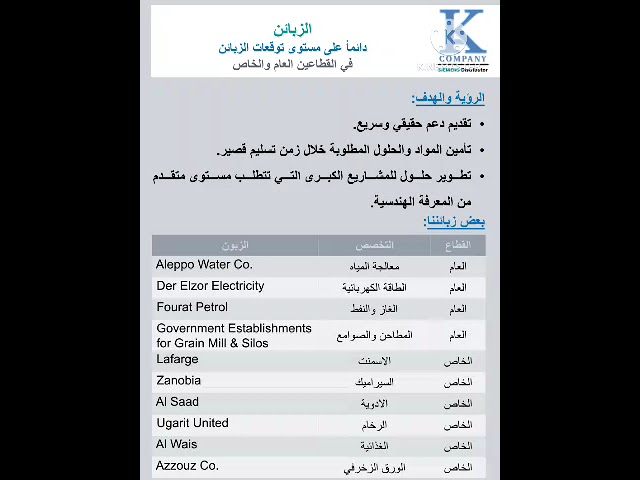 وتعتبر شركتنا من الشركات الرائدة محلياً في المجالات كافة. وقد قامت بدراسة وتنفيذ العديد من المشاريع الضخمة في سورية، حيث يعمل لديها العديد من المهندسين ذوي الكفاءة العالية والخاضعين لدورات تدريبية داخلياً وخارجياً لدى الشركات المعتمدة لدينا.